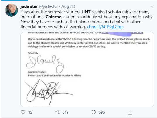 在美國請愿類信息網站“Change.org”上,一則為北得克薩斯州大學的中國留學生求助的網貼就表示,該校是在8月26日當天突然宣布中止受中國國家留學基金委員會資助的訪問學生和學者的學習資格的,并要求這些持有J-1類簽證的中國公派留學生和學者在1個月內離境??稍撔V两褚矝]有透露這么做的原因是什么。