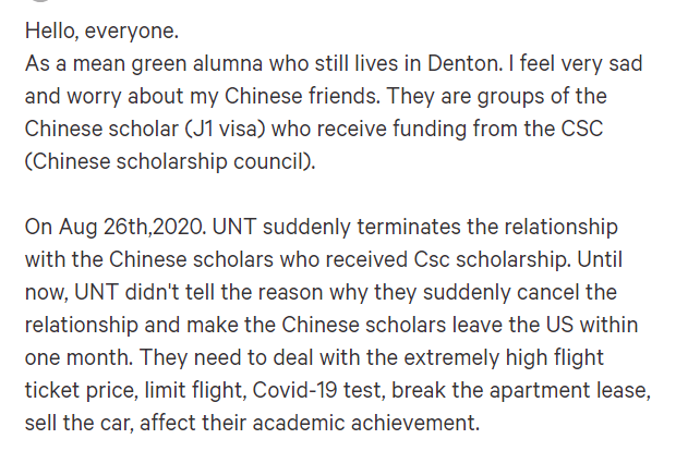 其中,一名直接參與了該校中國公派學生學者項目的教授,就在上述求助帖中留言,表示學校對這些中國留學生和學者的做法“是不公平的”,而且也是“毫無必要”的,因為他沒聽說過北得克薩斯州大學的任何中國公派留學生和學者中,有人遭到任何具體的指控。所以他無法理解為何學校要一下子就把所有中國公派留學生和學者全都趕走。