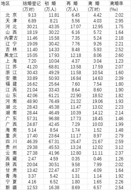表:2022年31個省份結婚登記、初婚、再婚、離婚及離婚率數(shù)據(jù)(數(shù)據(jù)來源:《中國統(tǒng)計年鑒2023》)