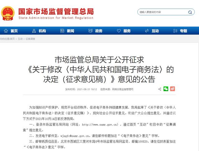 8月31日,市場(chǎng)監(jiān)管總局發(fā)布公告,針對(duì)《關(guān)于修改〈中華人民共和國(guó)電子商務(wù)法〉的決定(征求意見(jiàn)稿)》向社會(huì)公開(kāi)征求意見(jiàn)。市場(chǎng)監(jiān)管總局表示 ...
