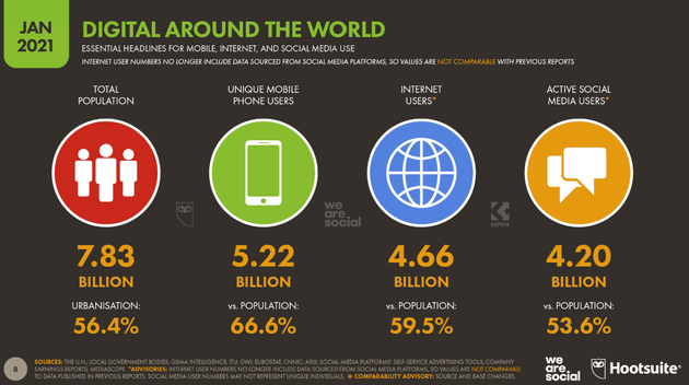 北京時(shí)間1月27日晚間消息,據(jù)報(bào)道,最新一份報(bào)告顯示,截至2021年1月,全球手機(jī)用戶數(shù)量為52 2億,互聯(lián)網(wǎng)用戶數(shù)量為46 6億,而社交媒體用戶 ...