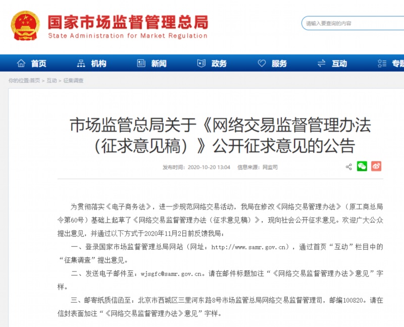 近日,國家市場監(jiān)管總局公布了《網(wǎng)絡(luò)交易監(jiān)督管理辦法(征求意見稿)》,進(jìn)一步規(guī)范網(wǎng)絡(luò)交易活動,將網(wǎng)絡(luò)直播帶貨等網(wǎng)絡(luò)交易新業(yè)態(tài)納入監(jiān)管范 ...