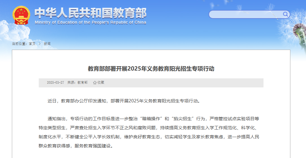 教育部部署開展2025年義務(wù)教育陽光招生專項行動近日,教育部辦公廳印發(fā)通知,部署開展2025年義務(wù)教育陽光招生專項行動。通知指出,專項行動 ...