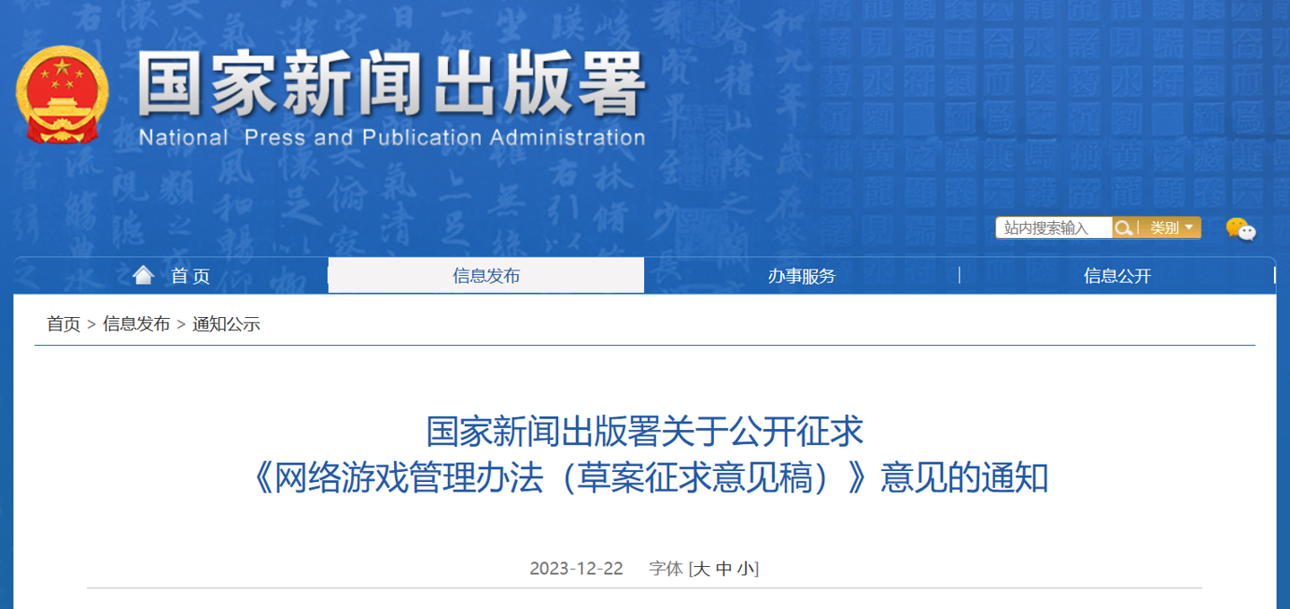 12月22日消息,國家新聞出版署今日發(fā)布《網(wǎng)絡(luò)游戲管理辦法(草案征求意見稿)》,現(xiàn)向社會公開征求意見。文件中提到,網(wǎng)絡(luò)游戲不得設(shè)置每日 ...