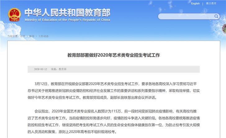 教育部:鼓勵藝考生網上提交作品與面試