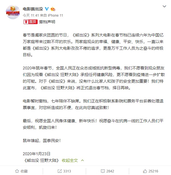 今天中午@電影熊出沒(méi) 23日發(fā)布撤檔聲明,2020年鼠年春節(jié),全國(guó)人民正在眾志成城抵抗新型病毒,我們不愿看到觀眾朋友們因?yàn)橛^看《熊出沒(méi)· ...