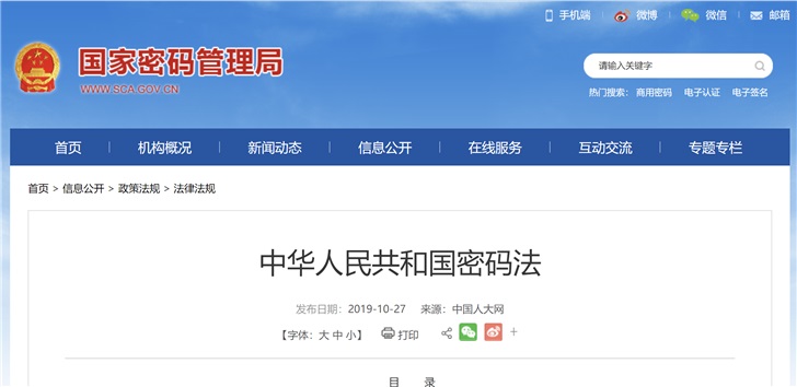 2020年1月1日正式施行《中華人民共和國密碼法》