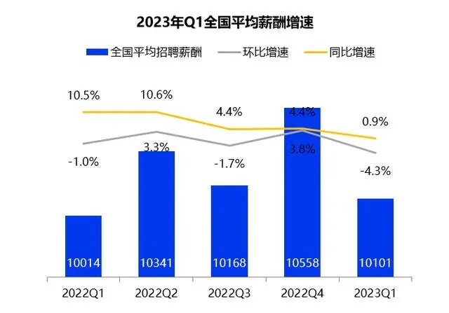 智聯(lián)招聘近日發(fā)布《中國企業(yè)招聘薪酬報(bào)告》,2023年一季度企業(yè)平均招聘薪酬為10101元 月,同比小幅上升0 9%;一季度薪酬較2022年四季度的105 ...