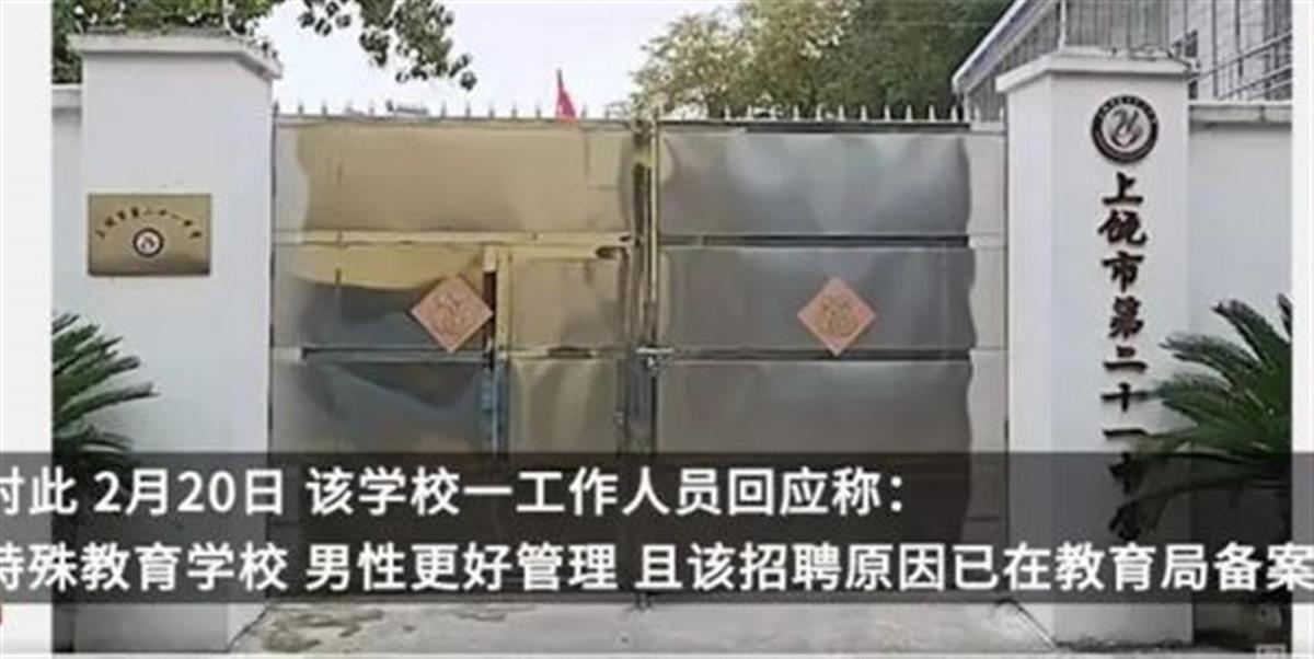 2月20日,江西上饒。網(wǎng)友爆料一中學(xué)招聘語(yǔ)文和美術(shù)教師只招收男性,引發(fā)熱議。該學(xué)校工作人員回應(yīng)稱(chēng):該校為特殊教育學(xué)校,招男性更方便管 ...