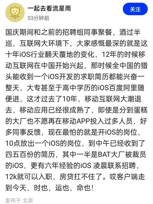 最近在手機(jī)某公眾號(hào)看到一篇文章《IOS大裁員,一半來自BAT大廠開發(fā)》。里面的截圖如下:其實(shí)這不是現(xiàn)在才有的現(xiàn)象,早在十年前,據(jù)有關(guān)平臺(tái) ...