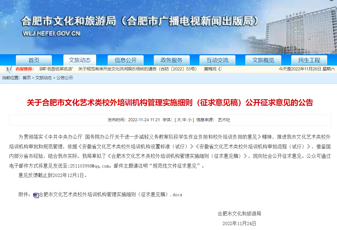 據(jù)合肥市文化和旅游局官網(wǎng)11月24日消息為貫徹落實(shí)《中共中央辦公廳國(guó)務(wù)院辦公廳關(guān)于進(jìn)一步減輕義務(wù)教育階段學(xué)生作業(yè)負(fù)擔(dān)和校外培訓(xùn)負(fù)擔(dān)的意 ...