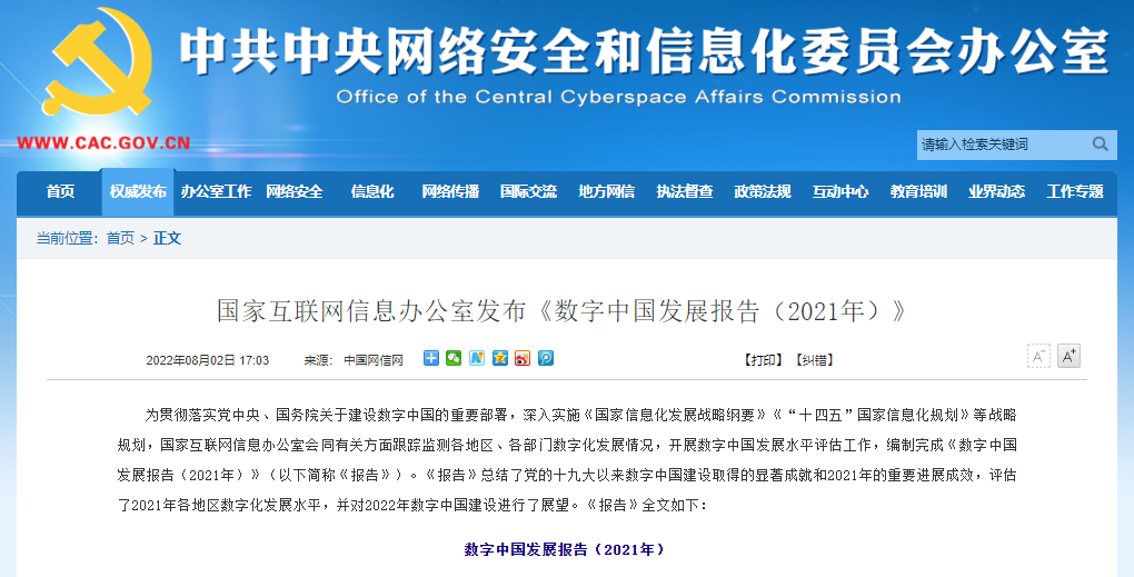8月3日消息,為評估2021年各地區(qū)數(shù)字化發(fā)展水平,并對2022年數(shù)字中國建設(shè)進行展望,國家互聯(lián)網(wǎng)信息辦公室昨日發(fā)布了《數(shù)字中國發(fā)展報告(202 ...