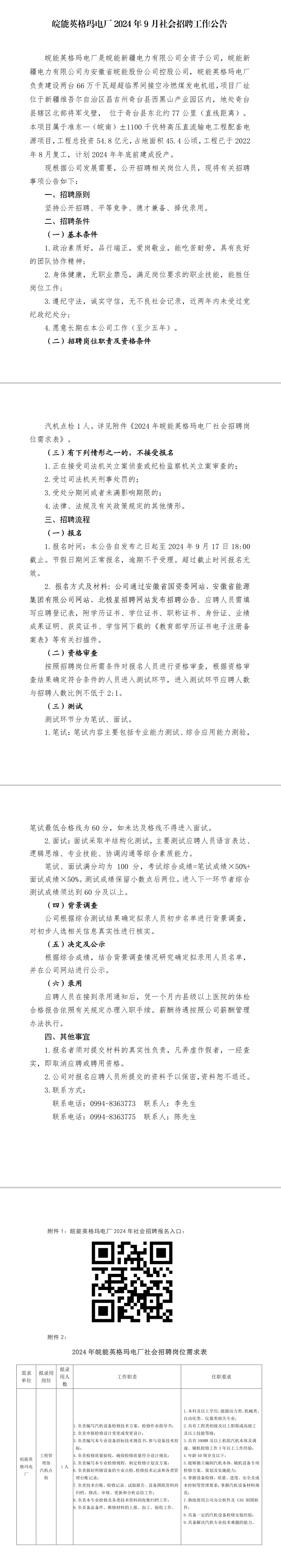 2024年皖能英格瑪電廠社會(huì)招聘工作公告