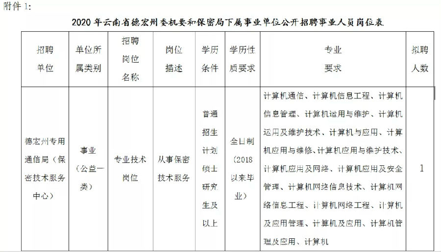 1.2020年云南省德宏州委機(jī)要和保密局下屬事業(yè)單位公開招聘事業(yè)人員崗位表