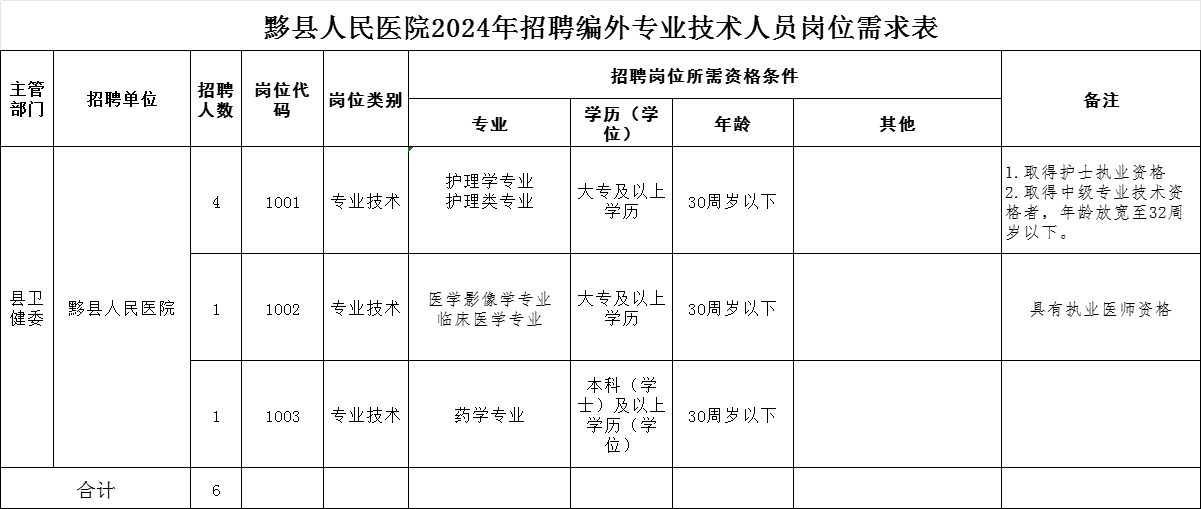 本次招聘共計3個崗位6名專業(yè)技術人員。詳見《黟縣人民醫(yī)院2024年招聘編外專業(yè)技術人員崗位需求表》