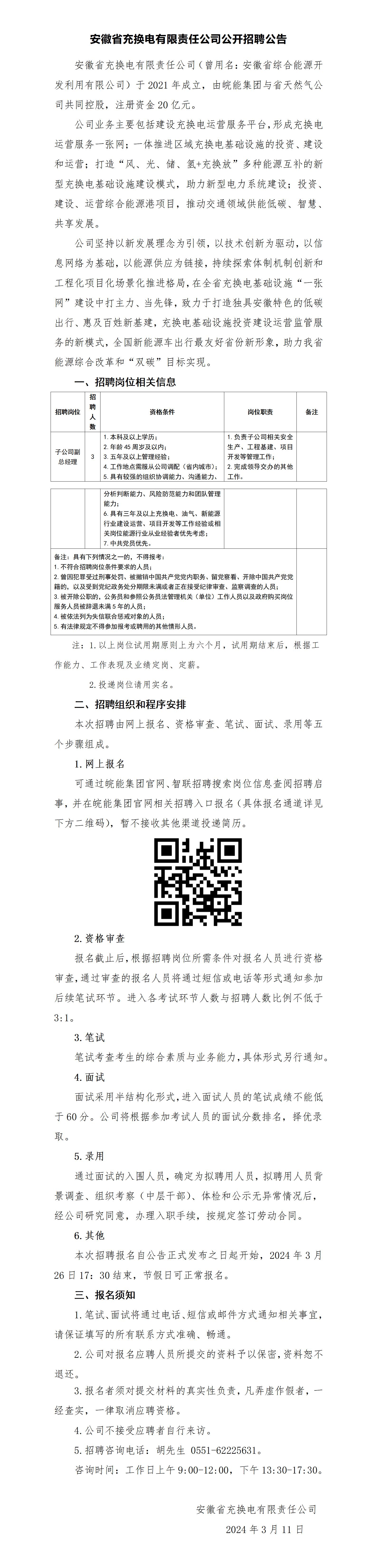 2024年安徽省充換電有限責(zé)任公司公開(kāi)招聘公告