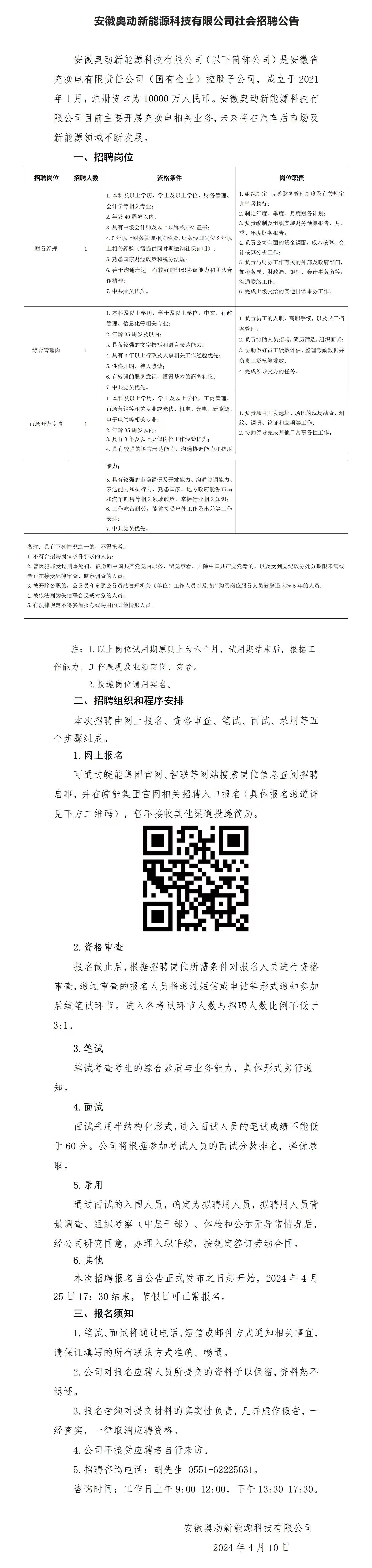 2024年安徽奧動新能源科技有限公司社會招聘公告