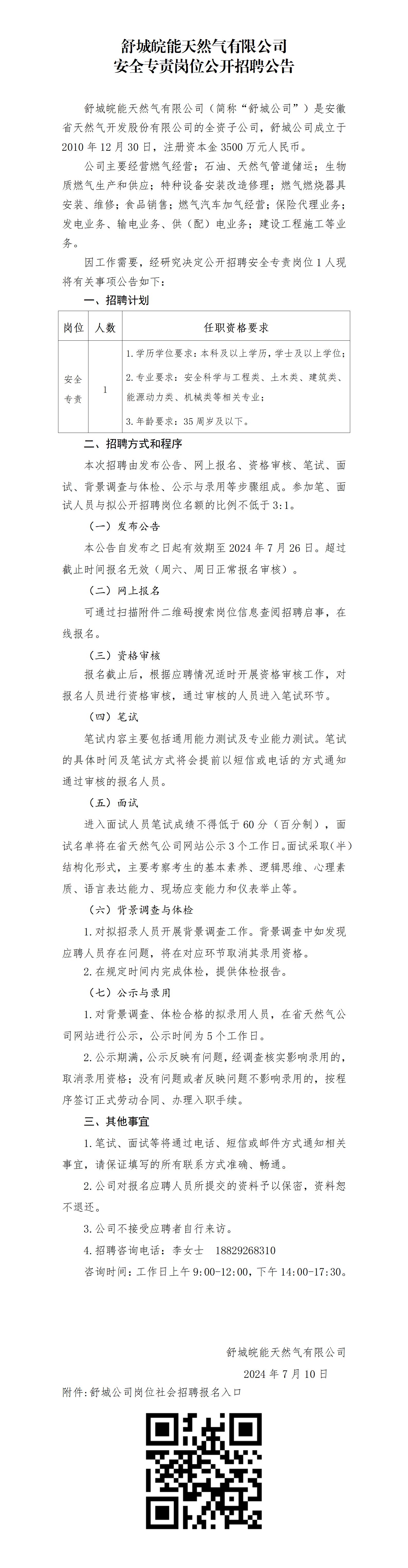 2024年六安舒城皖能天然氣有限公司安全專責崗位公開招聘公告