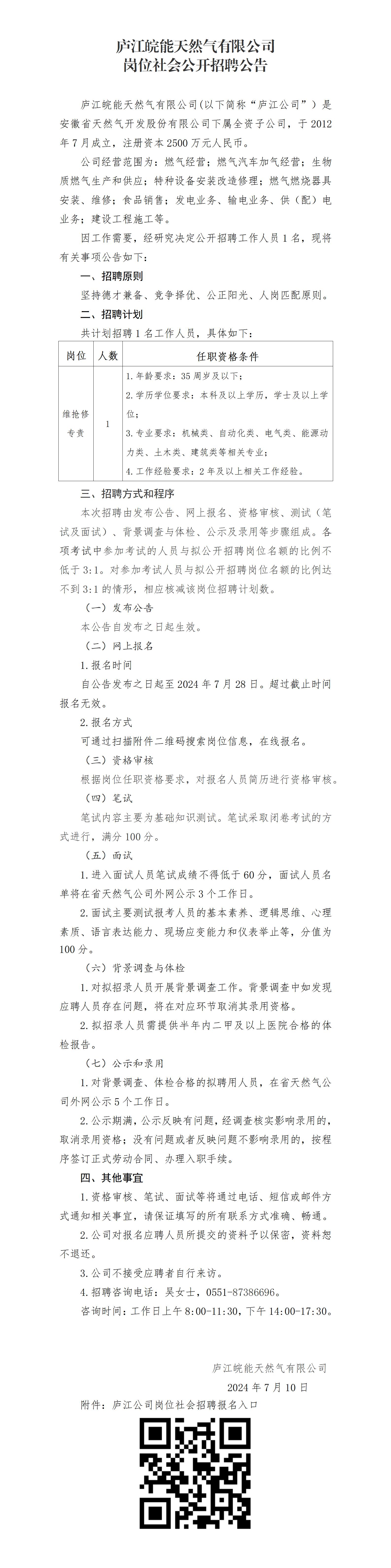 2024年合肥廬江皖能天然氣有限公司崗位社會公開招聘公告