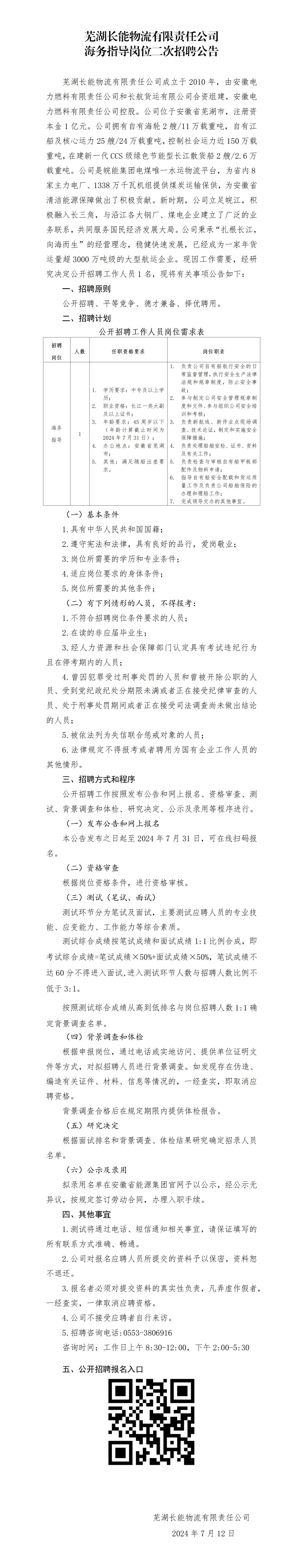 2024年蕪湖長(zhǎng)能物流有限責(zé)任公司海務(wù)指導(dǎo)崗位二次招聘公告
