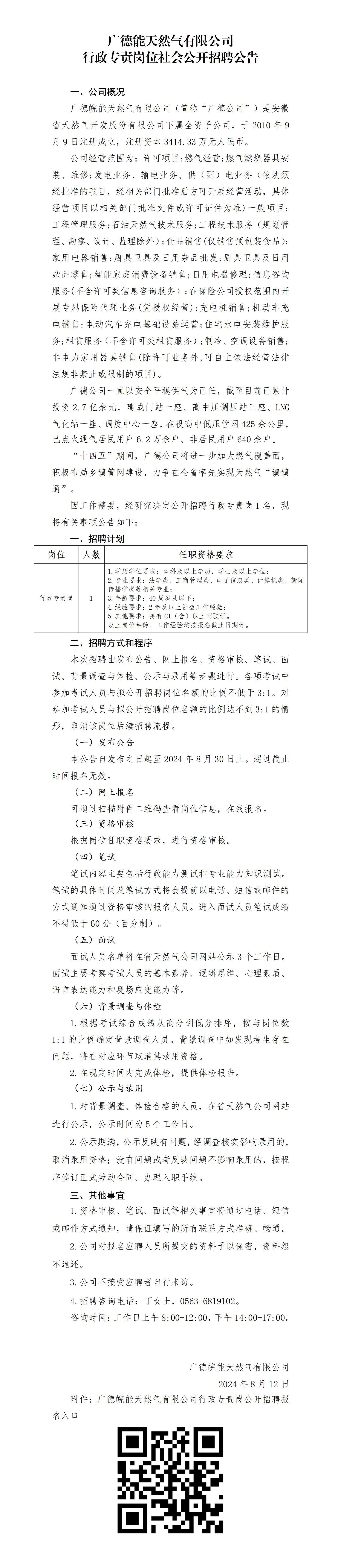 2024年宣城廣德皖能天然氣有限公司行政專責(zé)崗位社會公開招聘公告