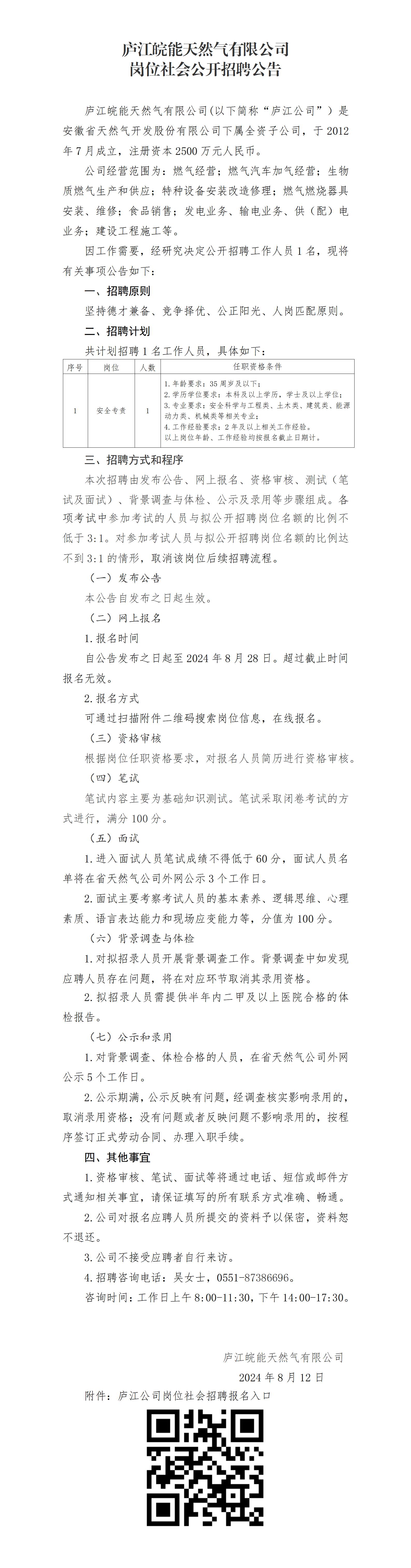 2024年合肥廬江皖能天然氣有限公司崗位社會(huì)公開(kāi)招聘公告