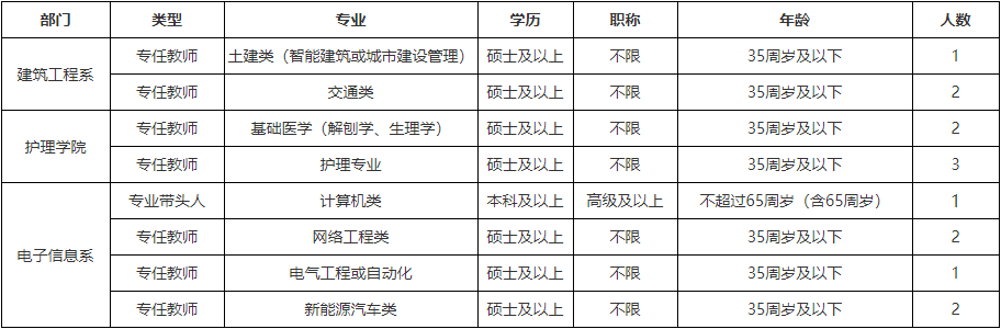 1、專業(yè)、學歷、職稱條件詳見表格,有職稱、教學經(jīng)驗或有企業(yè)工作經(jīng)歷并取得職業(yè)資格證書者優(yōu)先。