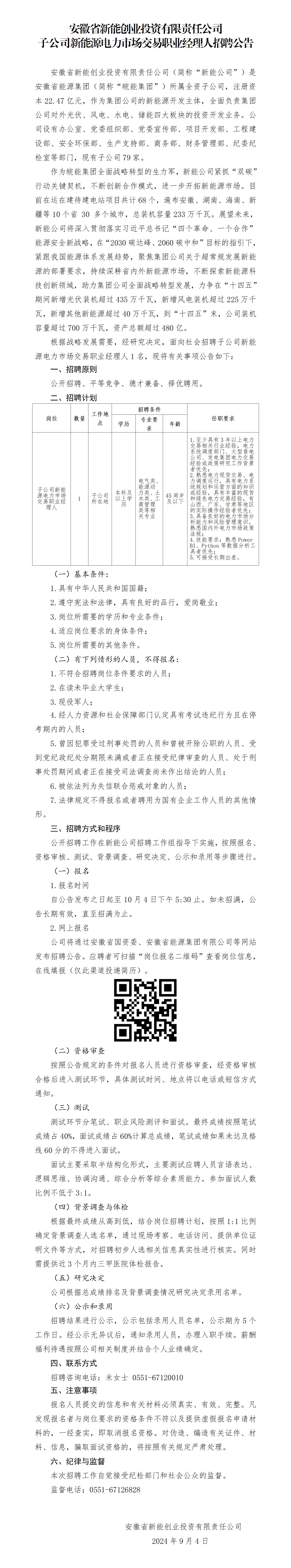 2024年安徽省新能創(chuàng)業(yè)投資有限責任公司子公司新能源電力市場交易職業(yè)經(jīng)理人招聘公告