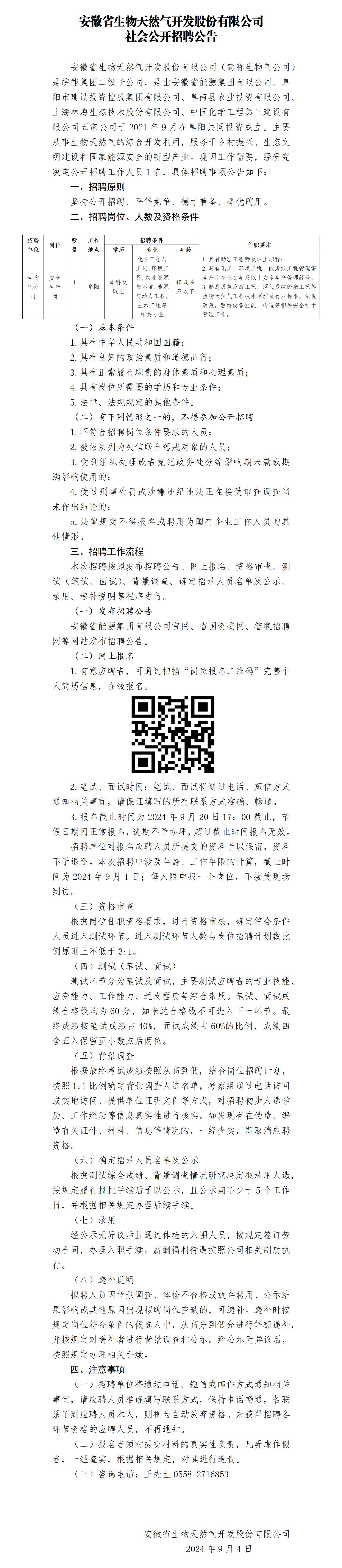 2024-09-11 15:14:57閱讀()安徽省能源集團有限公司安徽省生物天然氣開發(fā)股份有限公司(簡稱生物氣公司)是皖能集團二級子公司,是由安徽省能源集團有限公司、阜陽市建設投資控股集團有限公司、阜南縣農業(yè)投資有限公司、上海林海生態(tài)技術股份有限公司、中國化學工程第三建設有限公司五家公司于2021年9月在阜陽共同投資成立。主要從事生物天然氣的綜合開發(fā)利用,服務于鄉(xiāng)村振興、生態(tài)文明建設和國家能源安全的新型產業(yè)。現(xiàn)因工作需要,經(jīng)研究決定公開招聘工作人員1名,具體招聘事項公告如下: