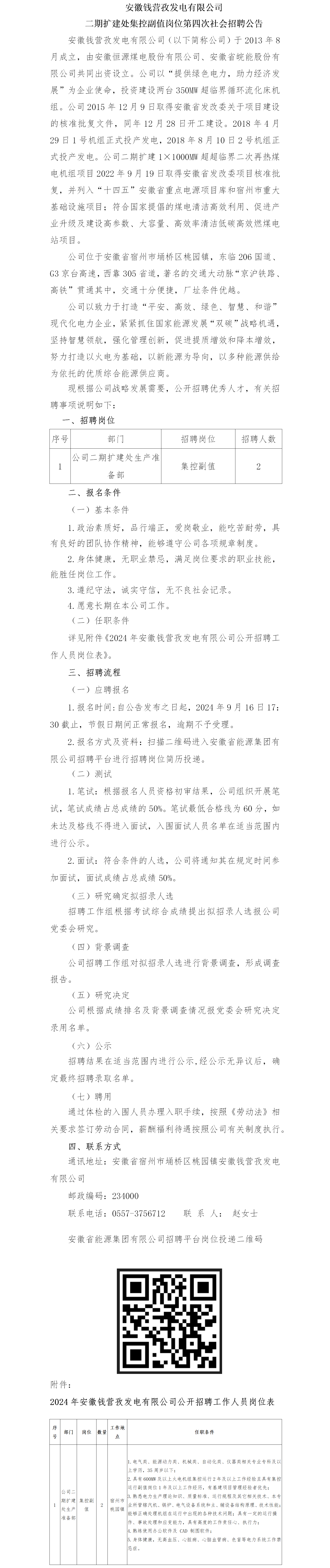 2024年宿州安徽錢營(yíng)孜發(fā)電有限公司二期擴(kuò)建處集控副值崗位第四次社會(huì)招聘公告