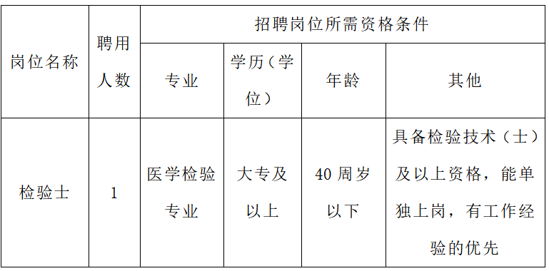 通過(guò)第三方勞務(wù)派遣方式招聘檢驗(yàn)士1名。