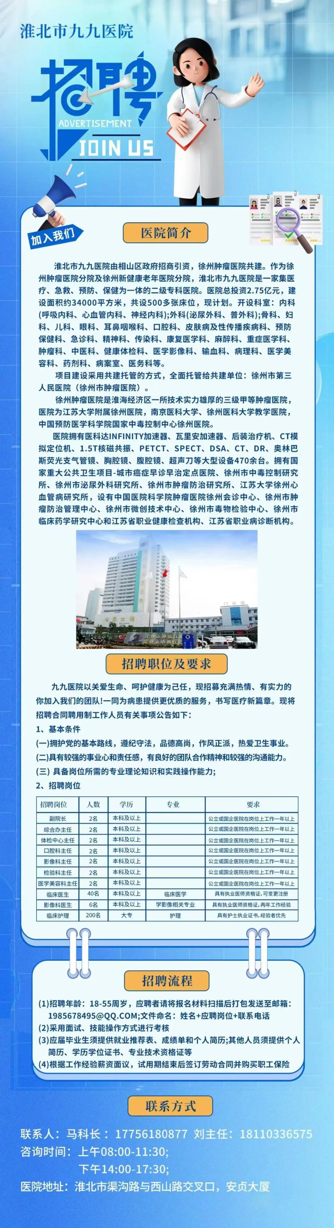 淮北市九九醫(yī)院由相山區(qū)政府招商引資,徐州腫瘤醫(yī)院共建。作為徐州腫瘤醫(yī)院分院及徐州新健康老年醫(yī)院分院,淮北市九九醫(yī)院是一家集醫(yī)療、急救、預(yù)防、保健為一體的二級(jí)專科醫(yī)院。醫(yī)院總投資2.75億元,建設(shè)面積約34000平方米,共設(shè)500多張床位,現(xiàn)計(jì)劃。開(kāi)設(shè)科室:內(nèi)科(呼吸內(nèi)科、心血管內(nèi)科、神經(jīng)內(nèi)科);外科(泌尿外科、普外科);骨科、婦科、兒科、眼科、耳鼻咽喉科、口腔科、皮膚病及性傳播疾病科、預(yù)防保健科、急診科、精神科、傳染科、康復(fù)醫(yī)學(xué)科、麻醉科、重癥醫(yī)學(xué)科、腫瘤科、中醫(yī)科、健康體檢科、醫(yī)學(xué)影像科、輸血科、病理科、醫(yī)學(xué)美容科、藥劑科、病案室、醫(yī)務(wù)科等。