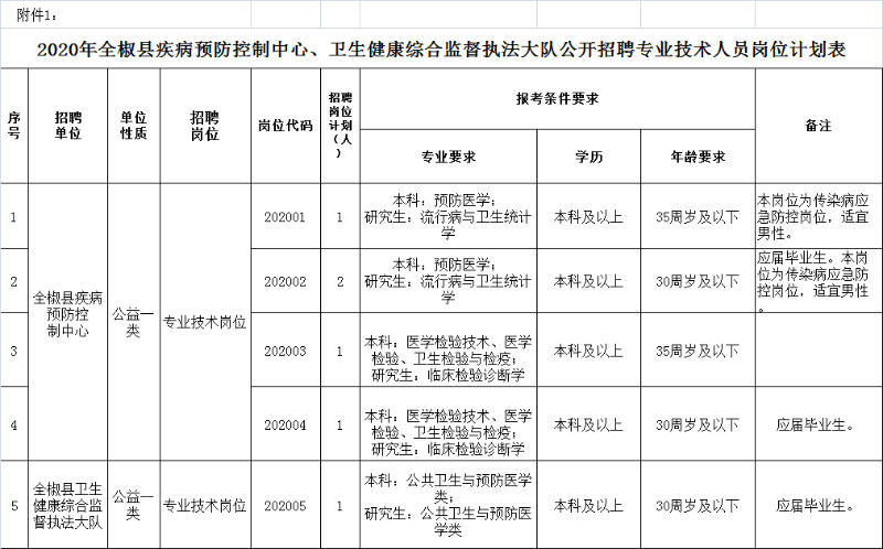 附件1:2020年全椒縣疾病預防控制中心、衛(wèi)生健康綜合監(jiān)督執(zhí)法大隊公開招聘專業(yè)技術(shù)人員崗位計劃表;