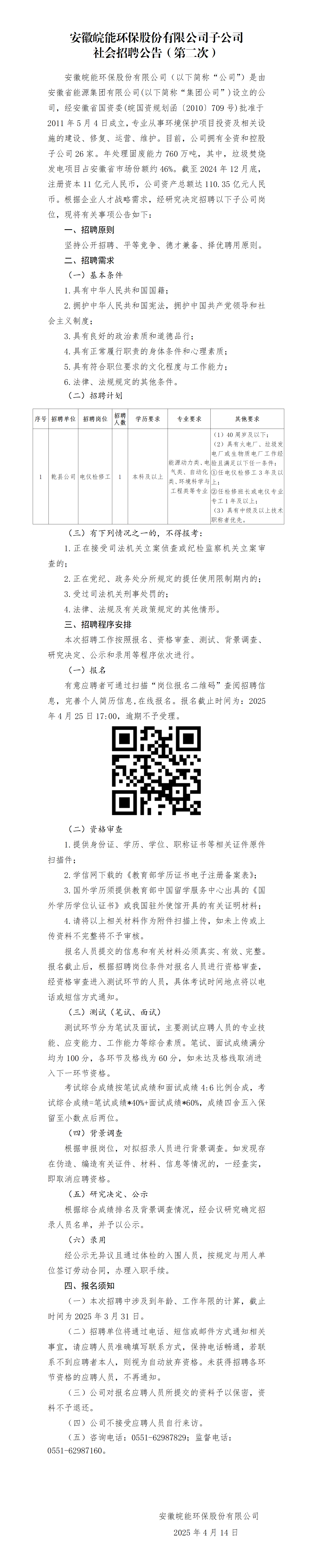 2025年安徽皖能環(huán)保股份有限公司子公司社會招聘公告(第二次)