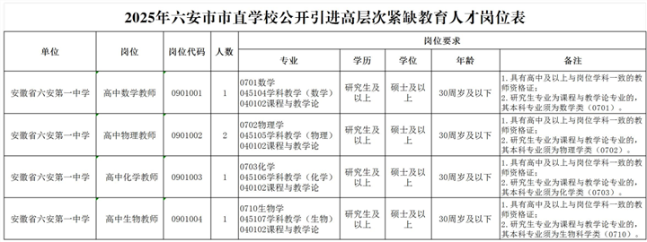 2025年安徽省六安第一中學(xué)引進(jìn)高層次緊缺教育人才共計(jì)5名。具體招聘崗位、條件如下: