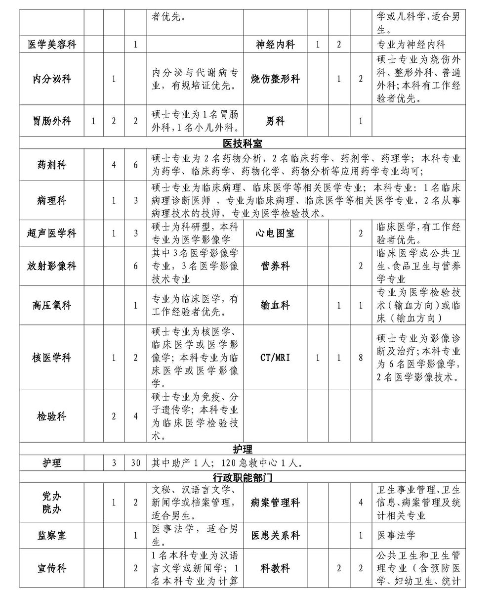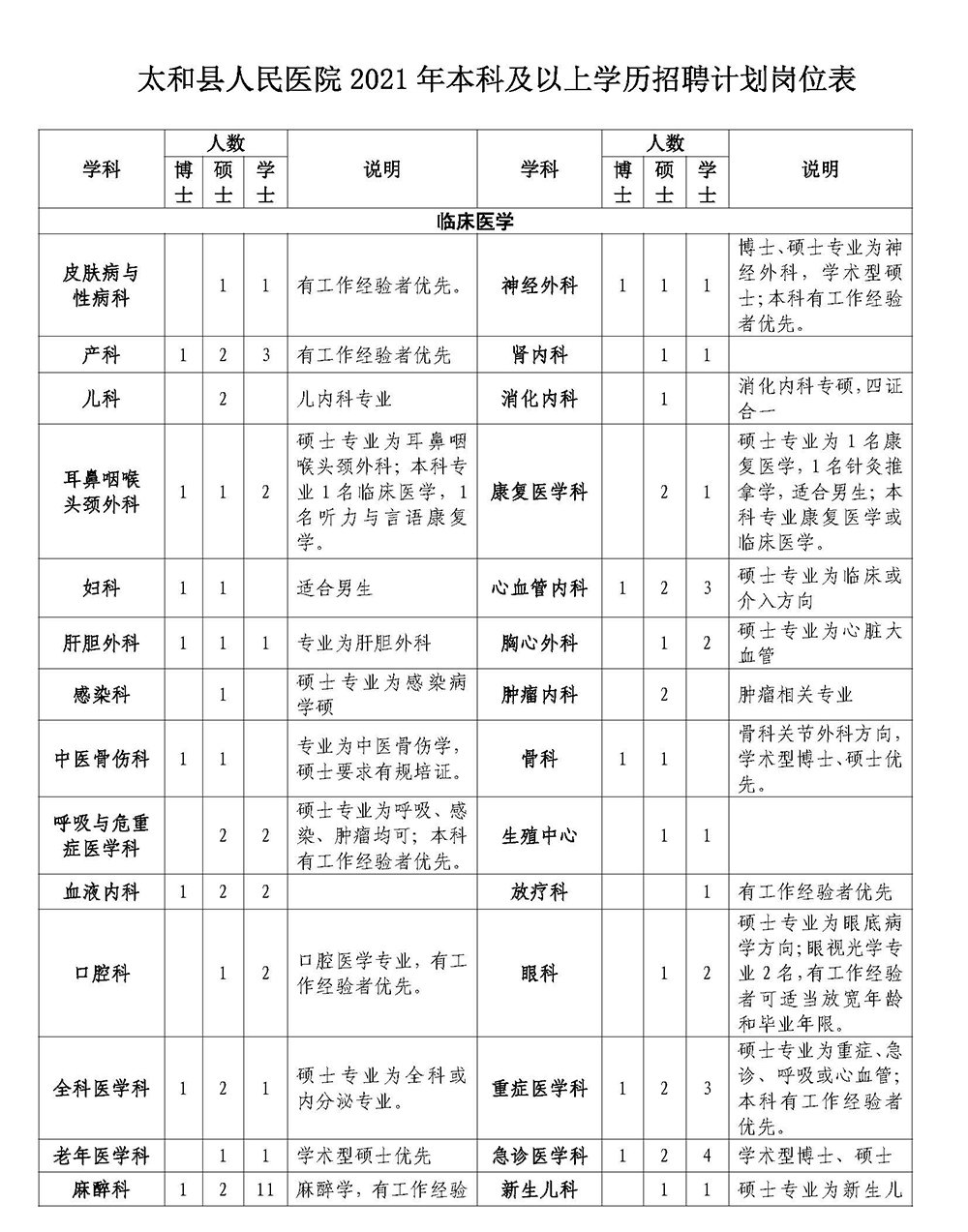 2020-12-12 17:08:27閱讀()太和縣人民醫(yī)院太和縣人民醫(yī)院是一所三級(jí)甲等綜合性醫(yī)院、互聯(lián)網(wǎng)醫(yī)院、住院醫(yī)師規(guī)范化培訓(xùn)基地、全國(guó)百?gòu)?qiáng)縣醫(yī)院。編制床位1600張;擁有磁共振2臺(tái)、CT6臺(tái)、DSA2臺(tái)以及直線加速器、PET-CT、體外循環(huán)機(jī)等國(guó)內(nèi)外先進(jìn)醫(yī)療設(shè)備。開設(shè)43個(gè)臨床學(xué)科、15個(gè)醫(yī)技科室;省級(jí)重點(diǎn)特色???個(gè)、市級(jí)重點(diǎn)???0個(gè),35萬平方米新院區(qū)將于2023年啟用。醫(yī)院現(xiàn)根據(jù)學(xué)科建設(shè)需要,2021年計(jì)劃招聘本科及以上學(xué)歷畢業(yè)生若干名?,F(xiàn)將有關(guān)事項(xiàng)公告如下: