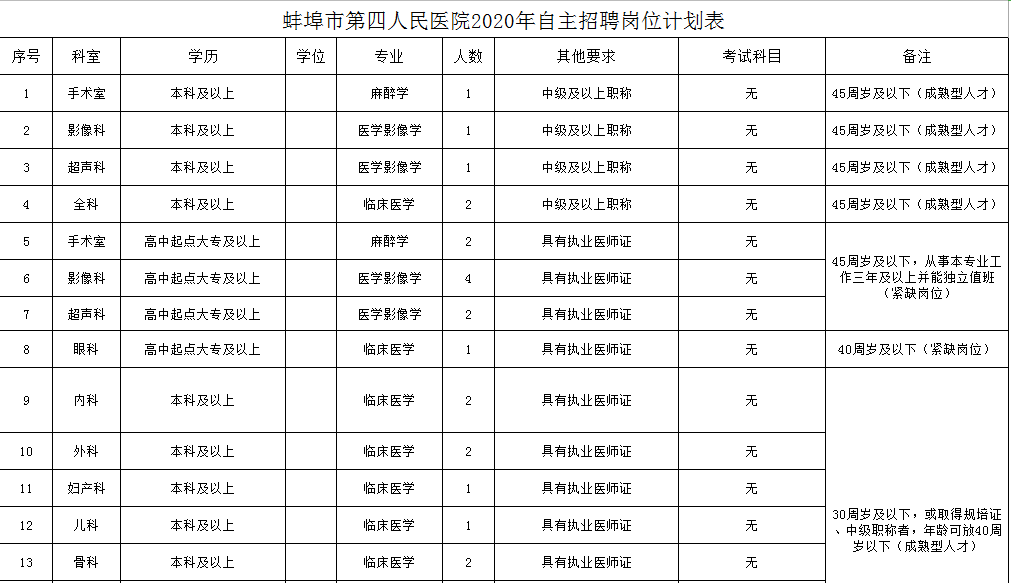 (三)應聘者戶籍所在地不限,年齡要求:公開招聘中年齡要求的“30周歲及以下”為“1990年12月28日(含)后出生”(其他涉及年齡計算的依此類推)。部分崗位另有要求的,詳見《蚌埠市第四人民醫(yī)院2020年公開招聘工作人員崗位計劃表》;