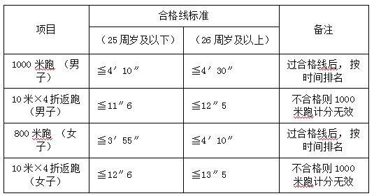 體能測試項目:男子1000米跑、女子800米跑,4×10米往返跑。測試標(biāo)準參照《公安機關(guān)錄用人民警察體能測評項目和標(biāo)準(暫行)》適當(dāng)放寬。