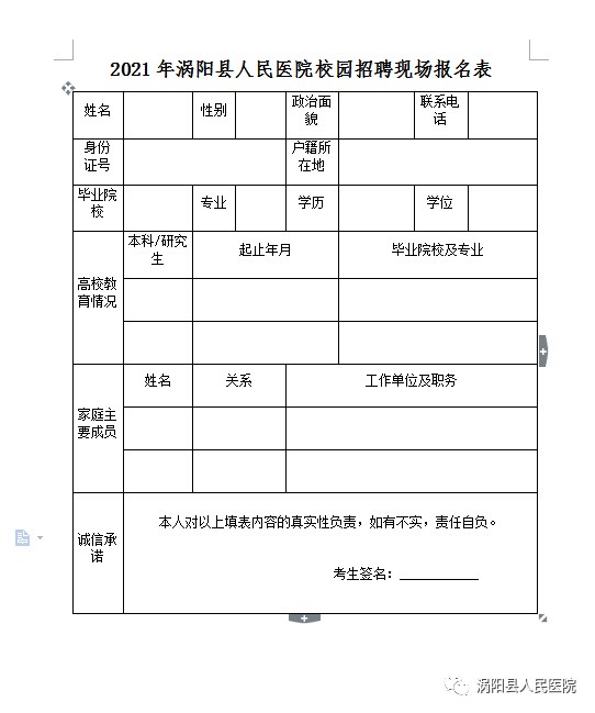 面試要求:面試人員應(yīng)填報(bào)《渦陽縣人民醫(yī)院現(xiàn)場招聘報(bào)名表》附件1,并攜帶本人身份證、就業(yè)推薦表、榮譽(yù)證書等相關(guān)證件原件及復(fù)印件一份,二寸近期免冠相片2張。