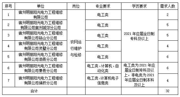 宿州明麗陽光電力維修工程有限責任公司(以下簡稱公司)是國網(wǎng)宿州供電公司產(chǎn)業(yè)單位,主要受托開展宿州地區(qū)所屬鄉(xiāng)鎮(zhèn)10千伏及以下配網(wǎng)設(shè)備現(xiàn)場巡檢維護、故障搶修,0.4千伏及以下客戶服務(wù)業(yè)務(wù)。根據(jù)公司發(fā)展需求,現(xiàn)面向社會公開招聘。