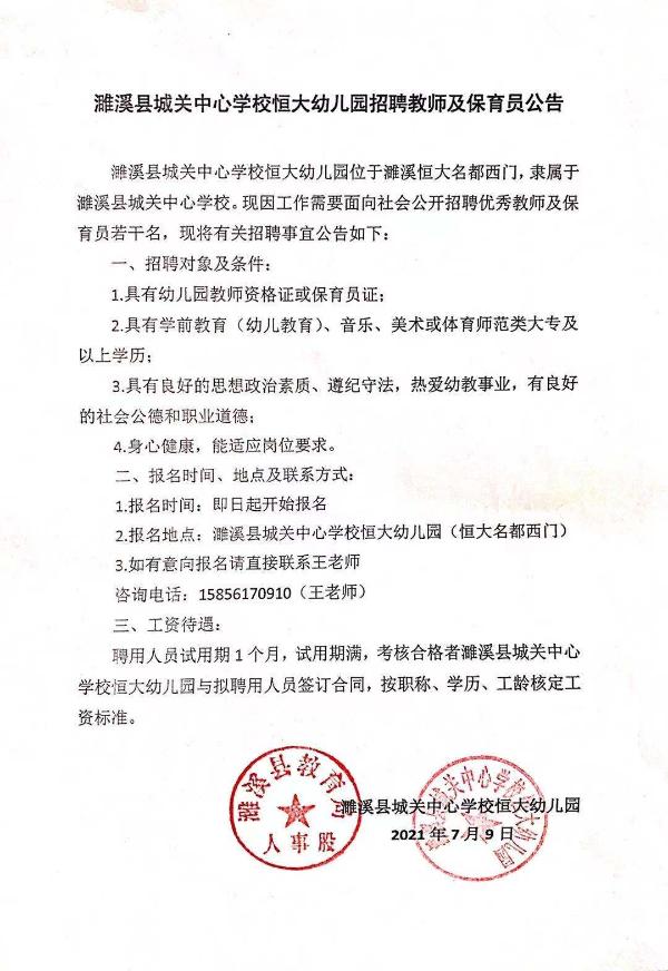 2021年淮北濉溪縣城關(guān)中心學(xué)校恒大幼兒園招聘教師及保育員公告
