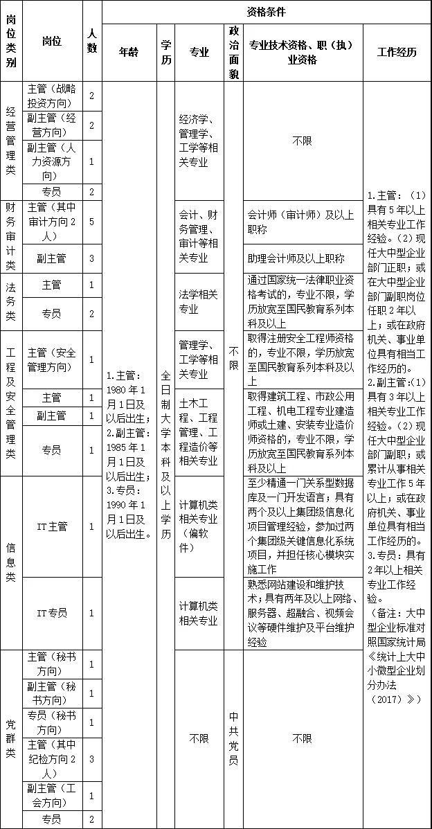 本次選聘競聘淮海實(shí)業(yè)集團(tuán)機(jī)關(guān)33個(gè)崗位(見下表)。集團(tuán)機(jī)關(guān)在崗工作人員參加競聘的,其資格條件按照《集團(tuán)公司管理和專業(yè)技術(shù)崗位管理辦法》(淮海發(fā)〔2020〕115號)第十二條的第三、四、五款執(zhí)行;其他人員報(bào)名按以下資格條件執(zhí)行。