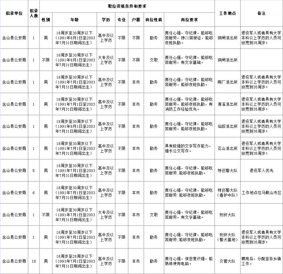 附件1:馬鞍山市公安局含山片區(qū)招聘警務(wù)輔助人員職位表