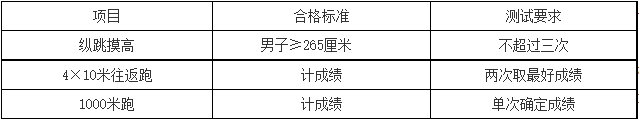 體能測(cè)試項(xiàng)目:縱跳摸高、4×10米往返跑、1000米跑。測(cè)試標(biāo)準(zhǔn)參照《公安機(jī)關(guān)錄用人民警察體能測(cè)評(píng)項(xiàng)目和標(biāo)準(zhǔn)》執(zhí)行。