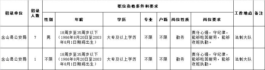 本次招聘警務(wù)輔助人員8名,具體職位見《馬鞍山市公安局含山片區(qū)招聘警務(wù)輔助人員職位表》(附件1)。