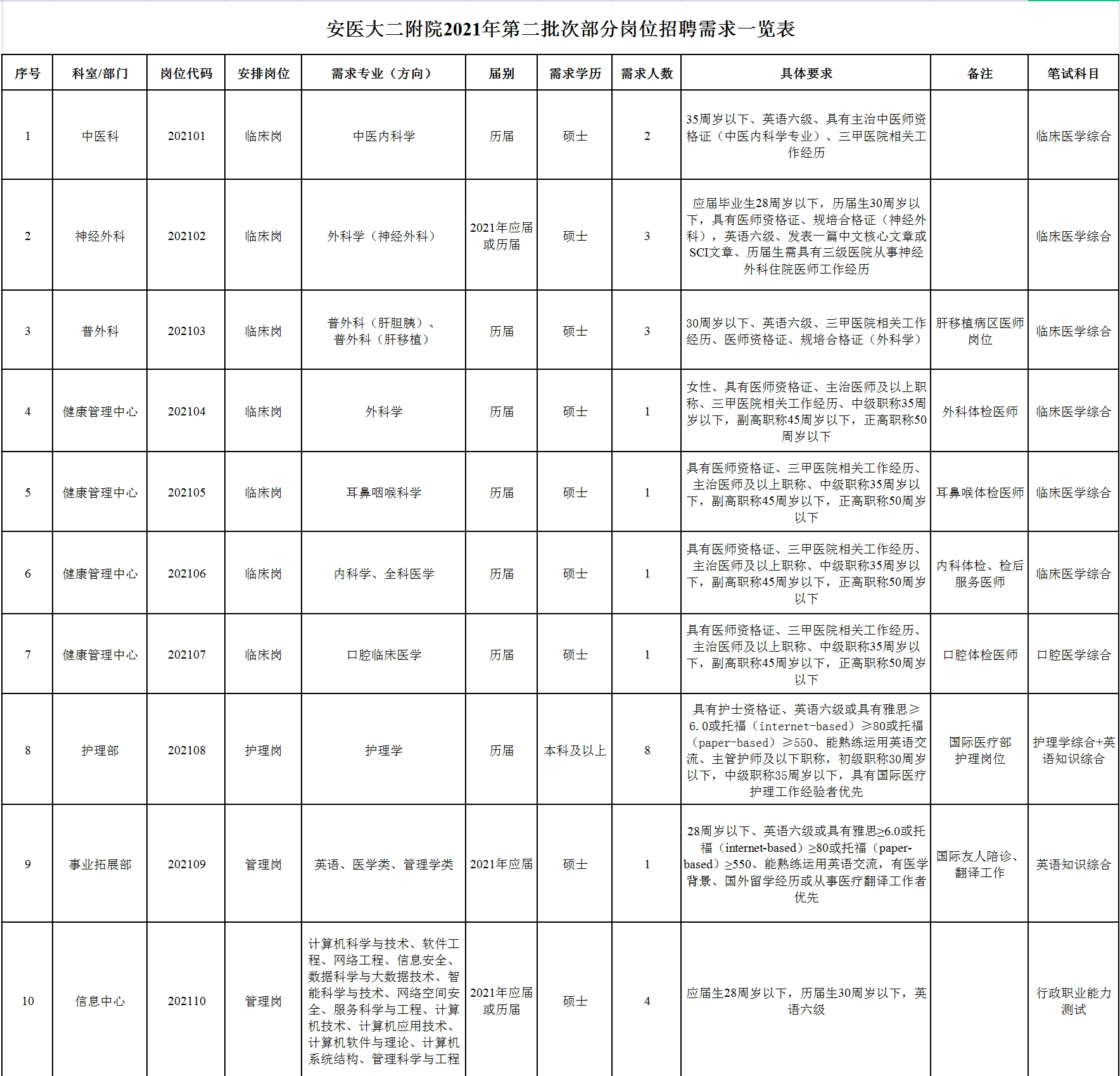 見(jiàn)附表(安醫(yī)大二附院2021年第二批次部分崗位招聘需求一覽表)