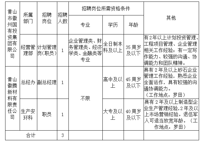 2021-09-14 20:46:58閱讀()黃山市徽州國(guó)有投資集團(tuán)有限公司徽州國(guó)投集團(tuán)及下屬子公司因工作需要,面向社會(huì)公開(kāi)招聘3名工作人員,其中集團(tuán)本部工作人員1名、徽騰新材料公司2名?,F(xiàn)將有關(guān)招聘事宜公告如下: