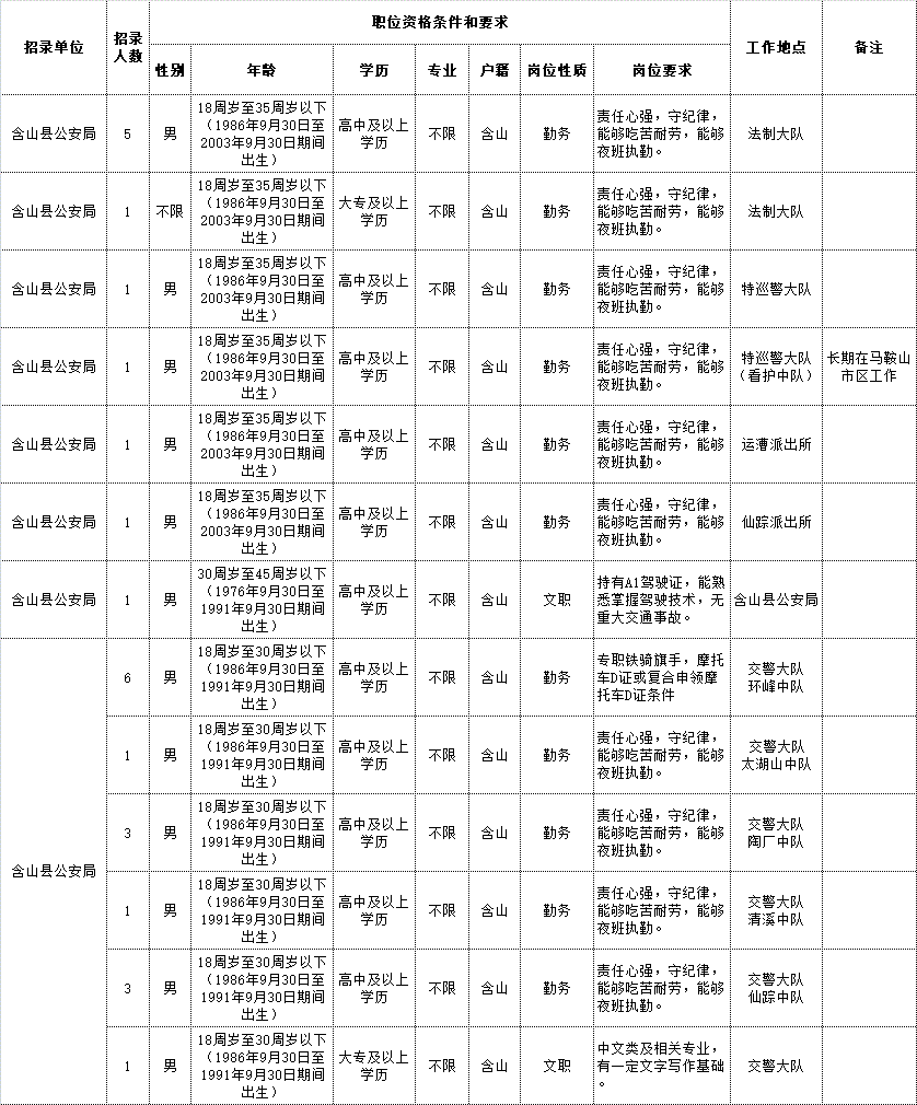 本次招聘警務(wù)輔助人員26名,具體職位見《馬鞍山市公安局含山片區(qū)招聘警務(wù)輔助人員職位表》(附件1)。