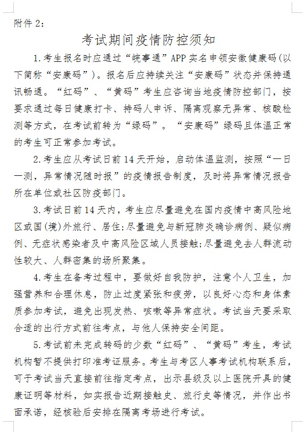 報(bào)考人員報(bào)名前,應(yīng)通過(guò)“皖事通”APP實(shí)名申領(lǐng)“安康碼”。報(bào)考人員報(bào)考前請(qǐng)認(rèn)真閱讀《考試期間疫情防控須知》(附件2)。報(bào)考人員提供的信息必須與本人實(shí)際情況、報(bào)考條件和所報(bào)考的崗位要求相一致。凡弄虛作假通過(guò)資格審查,其實(shí)際情況與報(bào)考條件規(guī)定不符的,一經(jīng)查實(shí),即取消考試、聘用等資格。