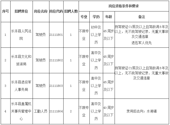 根據(jù)工作需要和有關(guān)規(guī)定,長豐縣直屬機(jī)關(guān)事務(wù)管理中心委托遠(yuǎn)創(chuàng)人力資源管理集團(tuán)有限公司面向社會公開招聘駕駛員3名和工勤人員2名。現(xiàn)將有關(guān)事項(xiàng)公告如下: